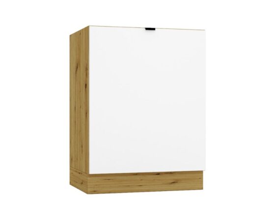 Alumine 60cm laiune kapp, kuhu peale saab paigaldada integreeritava pliidiplaadi. Ust saab avanema panna mõlemale poole. Korpuse ja sokli värv: tamm artisan. Ukse värv: matt valge. Materjal: lamineeritud mööbliplaat, 16mm. Jalad on reguleeritavad. Käepide: minimalistlik, plastikust. Hind ei sisalda töötasapinda.