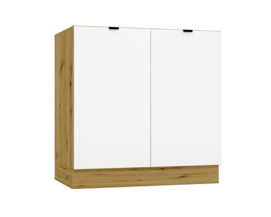 Alumine 80cm laiune valamukapp 2 uksega. Korpuse ja sokli värv: tamm artisan. Uste värv: matt valge. Materjal: lamineeritud mööbliplaat, 16mm. Jalad on reguleeritavad. Käepidemed: minimalistlikud, plastikust. Hind ei sisalda töötasapinda.