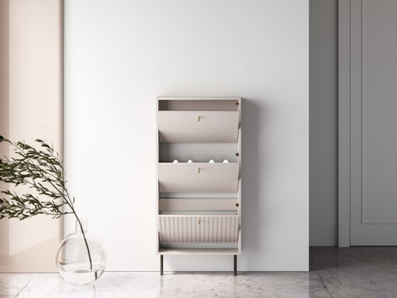 Jalanõude kapp 3 uksega. Toode on valmistatud kvaliteetsest lamineeritud mööbliplaadist + MDF. Värv: kašmiir. Jalad: metallist, musta värvi, h=15cm. Käepidemed: metallist, kuldset värvi. Mõõdud: laius 60cm, sügavus 15cm, kõrgus 126cm.