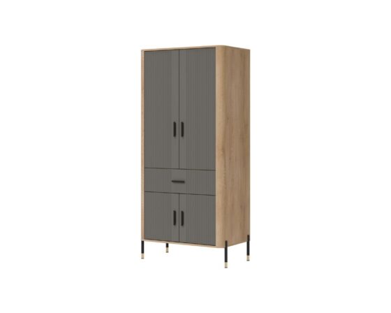 Riidekapp 4 ukse ja 1 sahtliga. Uksed ja sahtel on vaikselt sulguvad. Kapi sisu on näha pildil. Toode on valmistatud kvaliteetsest ja vastupidavast lamineeritud mööbliplaadist (16mm) + MDF (18mm). Korpuse värv: tamm cremona torro. Ukse värv: matt hall. Käepidemed: kuldsed või mustad. laius 93 cm, sügavus 56,5 cm, kõrgus 197 cm.