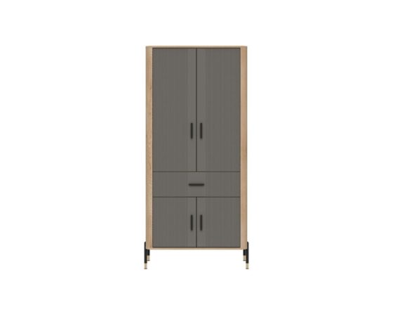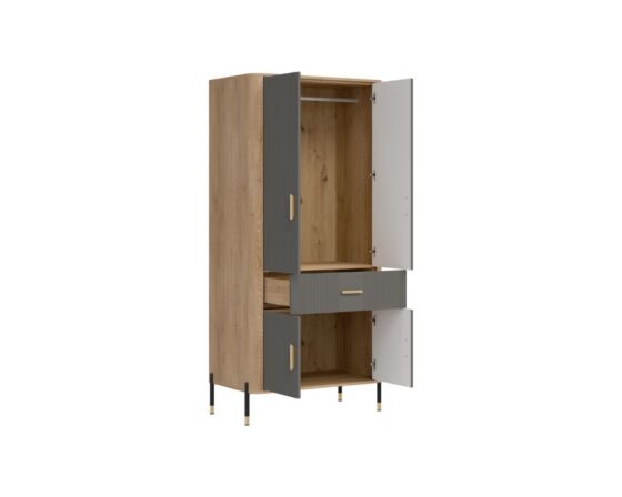 Riidekapp 4 ukse ja 1 sahtliga. Uksed ja sahtel on vaikselt sulguvad. Kapi sisu on näha pildil. Toode on valmistatud kvaliteetsest ja vastupidavast lamineeritud mööbliplaadist (16mm) + MDF (18mm). Korpuse värv: tamm cremona torro. Ukse värv: matt hall. Käepidemed: kuldsed või mustad.