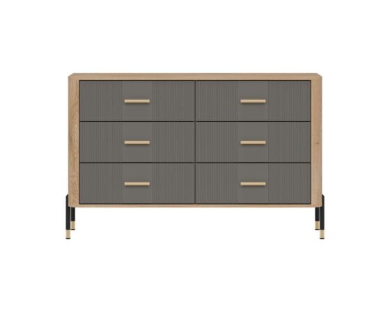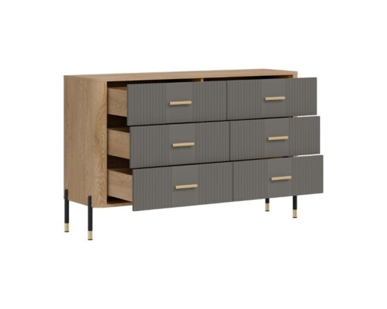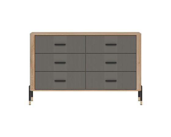 Kummut 6 sahtliga. Sahtlid on vaikselt sulguvad. Toode on valmistatud kvaliteetsest ja vastupidavast lamineeritud mööbliplaadist (16mm) + MDF (18mm). Korpuse värv: tamm cremona torro. Ukse värv: matt hall. Käepidemed: kuldsed või mustad.