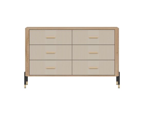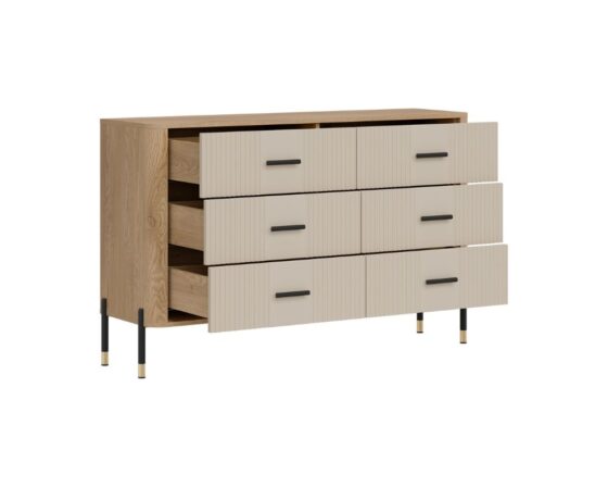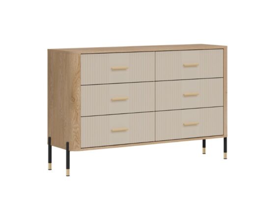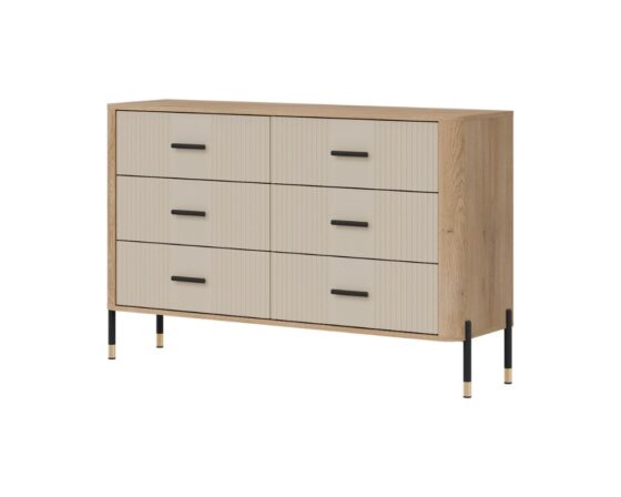 Kummut 6 sahtliga. Sahtlid on vaikselt sulguvad. Toode on valmistatud kvaliteetsest ja vastupidavast lamineeritud mööbliplaadist (16mm) + MDF (18mm). Korpuse värv: tamm cremona torro. Ukse värv: matt kašmiir. Käepidemed: kuldsed või mustad.
