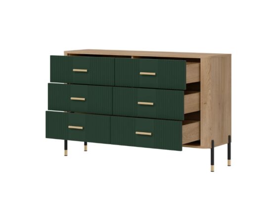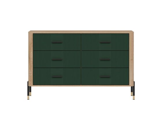 Kummut 6 sahtliga. Sahtlid on vaikselt sulguvad. Toode on valmistatud kvaliteetsest ja vastupidavast lamineeritud mööbliplaadist (16mm) + MDF (18mm). Korpuse värv: tamm cremona torro. Ukse värv: matt roheline. Käepidemed: kuldsed või mustad.
