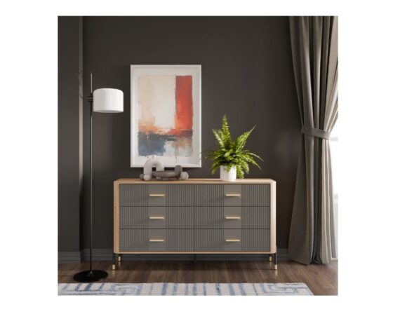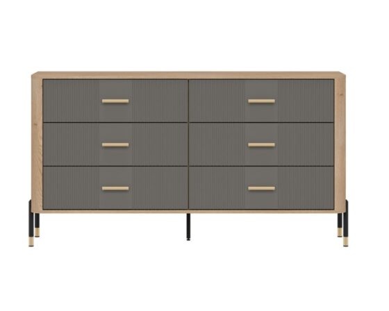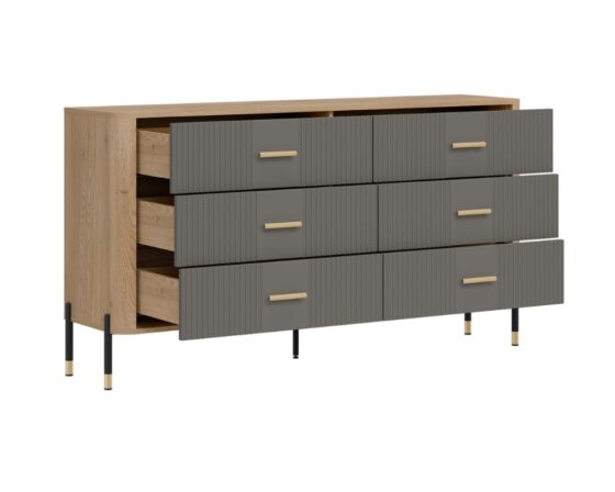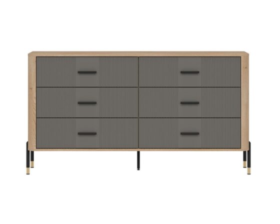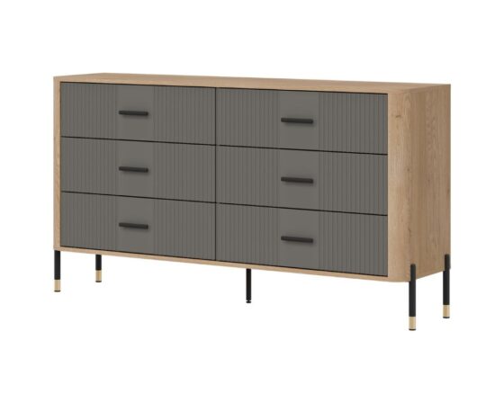 Kummut 6 sahtliga. Sahtlid on vaikselt sulguvad. Toode on valmistatud kvaliteetsest ja vastupidavast lamineeritud mööbliplaadist (16mm) + MDF (18mm). Korpuse värv: tamm cremona torro. Ukse värv: matt hall. Käepidemed: kuldsed või mustad. Mõõdud: laius 164,5 cm, sügavus 40 cm, kõrgus 88 cm.