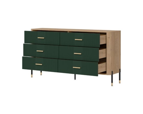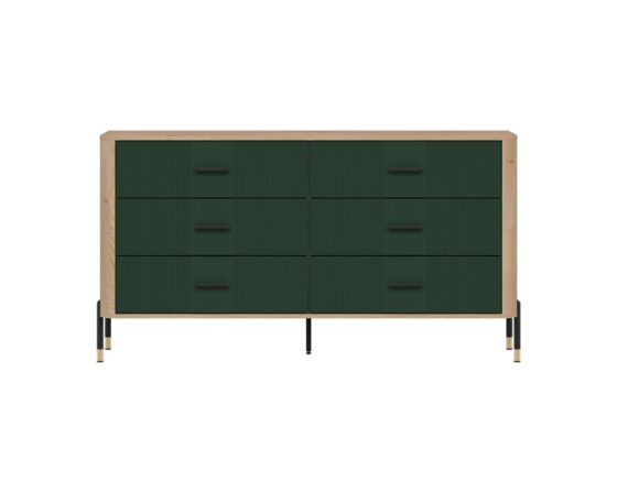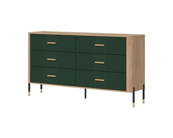Kummut 6 sahtliga. Sahtlid on vaikselt sulguvad. Toode on valmistatud kvaliteetsest ja vastupidavast lamineeritud mööbliplaadist (16mm) + MDF (18mm). Korpuse värv: tamm cremona torro. Ukse värv: matt roheline. Käepidemed: kuldsed või mustad. Mõõdud: laius 164,5 cm, sügavus 40 cm, kõrgus 88 cm.