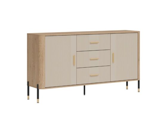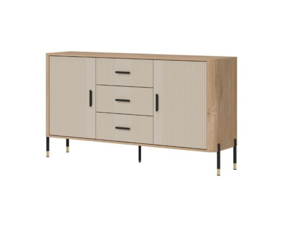 Kummut 2 ukse ja 3 sahtliga. Uksed ja sahtlid on vaikselt sulguvad. Toode on valmistatud kvaliteetsest ja vastupidavast lamineeritud mööbliplaadist (16mm) + MDF (18mm). Korpuse värv: tamm cremona torro. Ukse värv: matt kašmiir. Käepidemed: kuldsed või mustad. Mõõdud: laius 164,5 cm, sügavus 40 cm, kõrgus 88 cm.