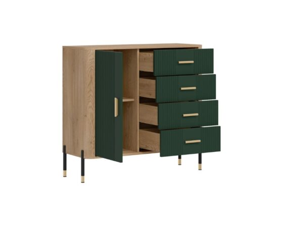 Kummut 1 ukse ja 4 sahtliga. Uks ja sahtlid on vaikselt sulguvad. Toode on valmistatud kvaliteetsest ja vastupidavast lamineeritud mööbliplaadist (16mm) + MDF (18mm). Korpuse värv: tamm cremona torro. Ukse värv: matt roheline. Käepidemed: kuldsed või mustad. Mõõdud: laius 108,5 cm, sügavus 40 cm, kõrgus 100 cm.