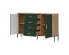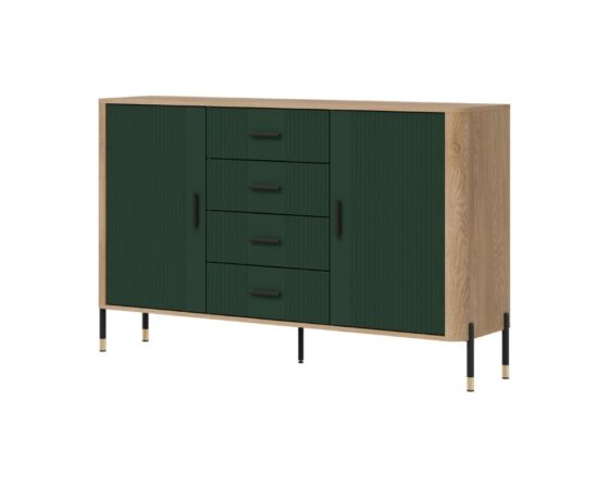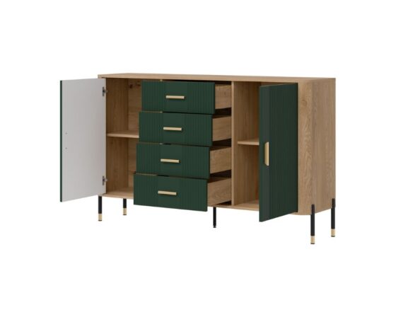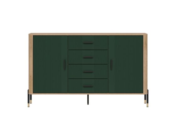 Kummut 2 ukse ja 4 sahtliga. Uksed ja sahtlid on vaikselt sulguvad. Toode on valmistatud kvaliteetsest ja vastupidavast lamineeritud mööbliplaadist (16mm) + MDF (18mm). Korpuse värv: tamm cremona torro. Ukse värv: matt roheline. Käepidemed: kuldsed või mustad.