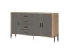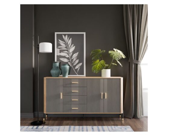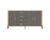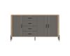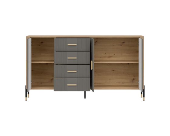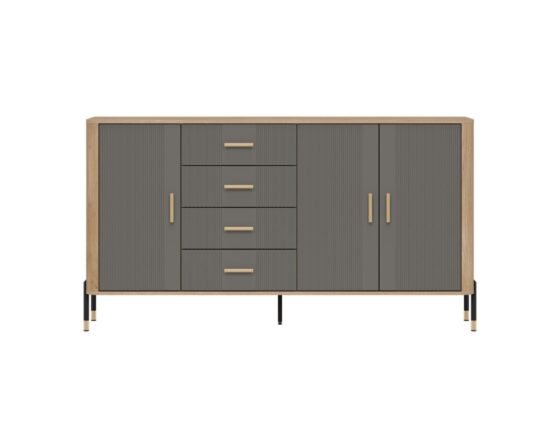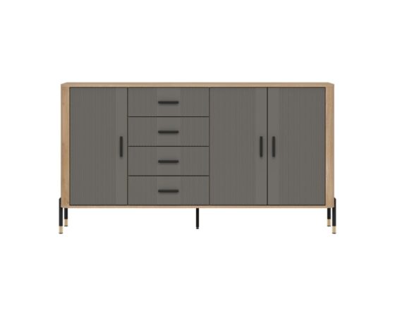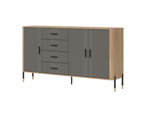 Kummut 3 ukse ja 4 sahtliga. Uksed ja sahtlid on vaikselt sulguvad. Toode on valmistatud kvaliteetsest ja vastupidavast lamineeritud mööbliplaadist (16mm) + MDF (18mm). Korpuse värv: tamm cremona torro. Ukse värv: matt hall. Käepidemed: kuldsed või mustad. Mõõdud: laius 185,5 cm, sügavus 40 cm, kõrgus 100 cm.