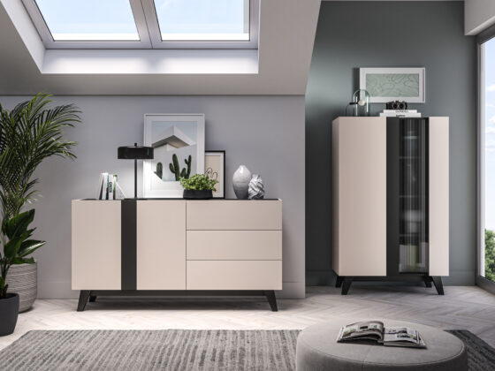 Kummut 2 ukse ja 3 sahtliga. Uksed on vaikselt sulguvad. Toode on valmistatud kvaliteetsest ja vastupidavast lamineeritud mööbliplaadist, servad kanditud ABS plastikuga. Värv: kašmiir/matt must.