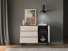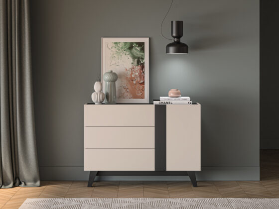 Kummut 1 ukse ja 3 sahtliga. Uksed on vaikselt sulguvad. Toode on valmistatud kvaliteetsest ja vastupidavast lamineeritud mööbliplaadist, servad kanditud ABS plastikuga. Värv: kašmiir/matt must.