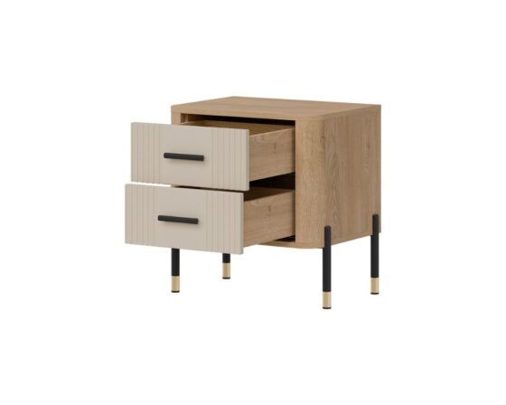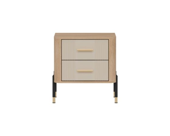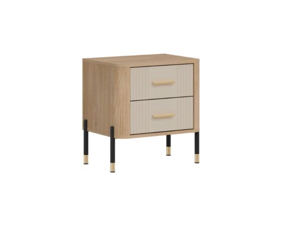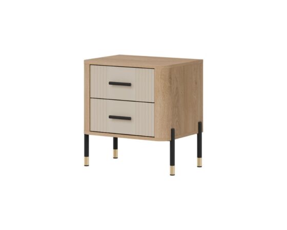Öökapp 2 sahtliga. Sahtlid on vaikselt sulguvad. Toode on valmistatud kvaliteetsest ja vastupidavast lamineeritud mööbliplaadist (16mm) + MDF (18mm). Korpuse värv: tamm cremona torro. Sahtli esipaneeli värv: matt kašmiir. Käepidemed: kuldsed või mustad. Mõõdud: laius 56 cm, sügavus 40 cm, kõrgus 57 cm.