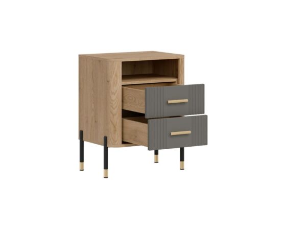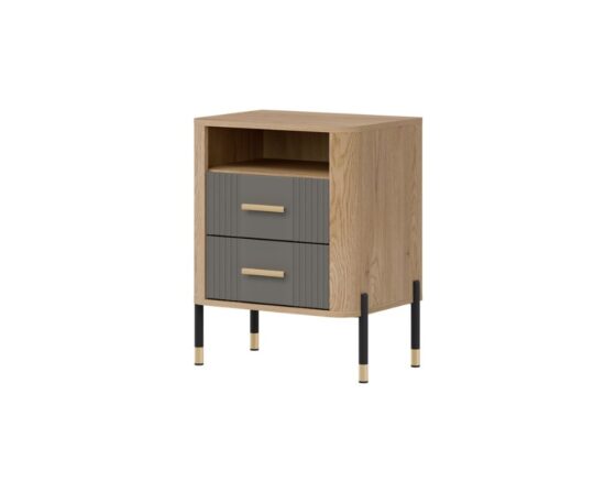 Öökapp 2 sahtliga. Sahtlid on vaikselt sulguvad. Toode on valmistatud kvaliteetsest ja vastupidavast lamineeritud mööbliplaadist (16mm) + MDF (18mm). Korpuse värv: tamm cremona torro. Sahtli esipaneeli värv: matt hall. Käepidemed: kuldsed või mustad. Mõõdud: laius 56 cm, sügavus 40 cm, kõrgus 69 cm.