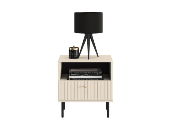Öökapp 1 sahtliga. Toode on valmistatud kvaliteetsest lamineeritud mööbliplaadist + MDF. Värv: kašmiir. Jalad: metallist, musta värvi, h=15cm. Käepide: metallist, kuldset värvi. Mõõdud: laius 50cm, sügavus 34cm, kõrgus 53cm.