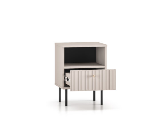 Öökapp 1 sahtliga. Toode on valmistatud kvaliteetsest lamineeritud mööbliplaadist + MDF. Värv: kašmiir. Jalad: metallist, musta värvi, h=15cm. Käepide: metallist, kuldset värvi. Mõõdud: laius 40cm, sügavus 34cm, kõrgus 53cm.