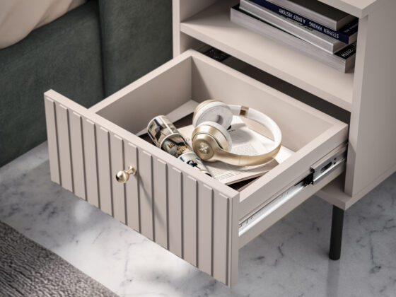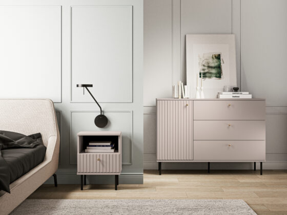 Öökapp 1 sahtliga. Toode on valmistatud kvaliteetsest lamineeritud mööbliplaadist + MDF. Värv: kašmiir. Jalad: metallist, musta värvi, h=15cm. Käepide: metallist, kuldset värvi.