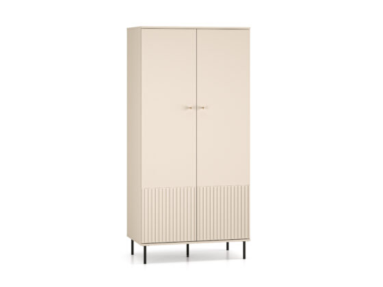 Kahe uksega riidekapp. Kapi sisu on näha pildil. Toode on valmistatud kvaliteetsest lamineeritud mööbliplaadist + MDF. Värv: kašmiir. Jalad: metallist, musta värvi, h=15cm. Käepidemed: metallist, kuldset värvi. Mõõdud: laius 92cm, sügavus 53cm, kõrgus 190cm.