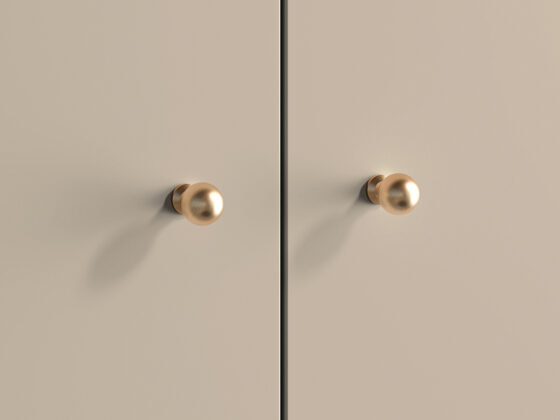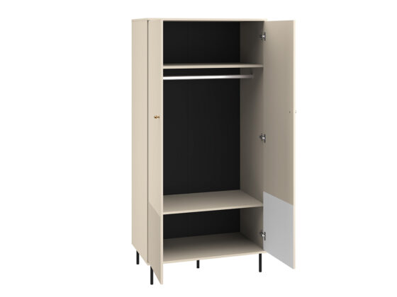 Kahe uksega riidekapp. Kapi sisu on näha pildil. Toode on valmistatud kvaliteetsest lamineeritud mööbliplaadist + MDF. Värv: kašmiir. Jalad: metallist, musta värvi, h=15cm. Käepidemed: metallist, kuldset värvi.