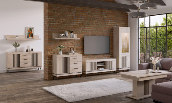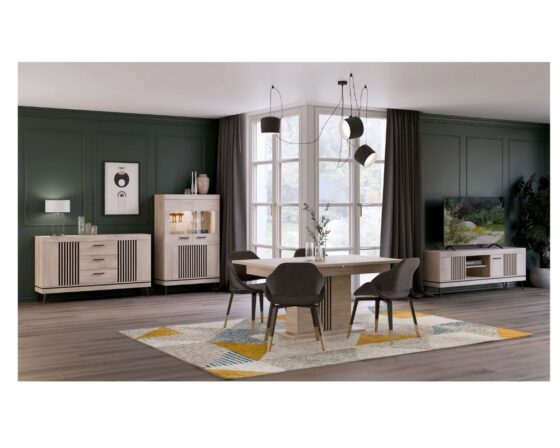 TV-laud 3 uksega. Uksed on vaikselt sulguvad. Toode on valmistatud kvaliteetsest ja vastupidavast lamineeritud mööbliplaadist (16mm) + MDF. Värv: tamm cremona cotta/ must. Jalad ja käepidemed: plastikust.