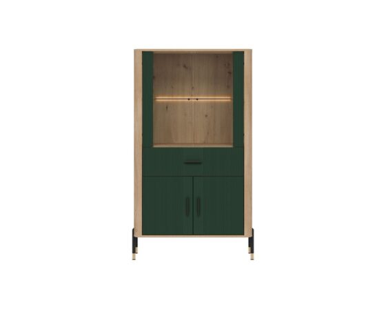 Vitriinkapp 4 ukse ja 1 sahtliga. Uksed ja sahtel on vaikselt sulguvad. Toode on valmistatud kvaliteetsest ja vastupidavast lamineeritud mööbliplaadist (16mm) + MDF (18mm). Korpuse värv: tamm cremona torro. Ukse värv: matt roheline. Käepidemed: kuldsed või mustad. Pildil näha olev LED-valgustus ei sisaldu hinnas (võimalik juurde tellida, hind 30 eur).