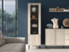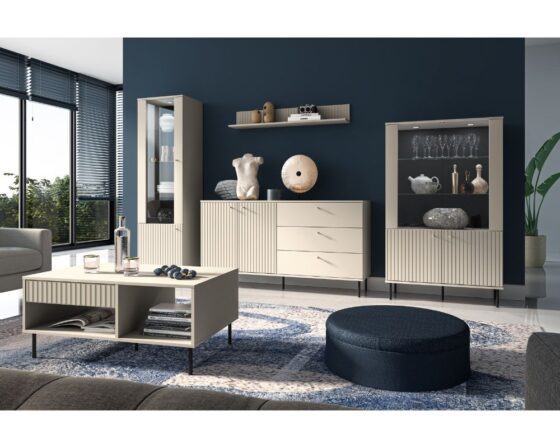 Vitriinkapp 2 uksega. Toode on valmistatud kvaliteetsest lamineeritud mööbliplaadist + MDF. Värv: kašmiir. Jalad: metallist, musta värvi, h=15cm. Käepidemed: metallist, kuldset värvi.