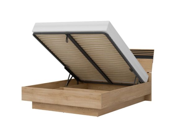 Voodi hind sisaldab ülestõstetavat metallraamil sõrestikku ning voodialust kasti. Madrats ei kuulu komplekti. Voodile sobib 160x200cm madrats. Toode on valmistatud kvaliteetsest ja vastupidavast lamineeritud mööbliplaadist + MDF. Plaadi paksus 16mm. Värv: tamm Cremona torro + matt must.