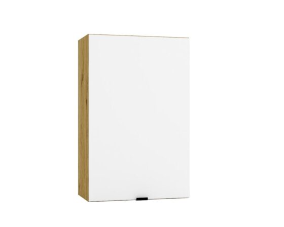 Ülemine 45cm laiune kapp 1 uksega. Ust saab avanema panna mõlemale poole. Korpuse värv: tamm artisan. Ukse värv: matt valge. Materjal: lamineeritud mööbliplaat, 16mm. Käepide: minimalistlik, plastikust.
